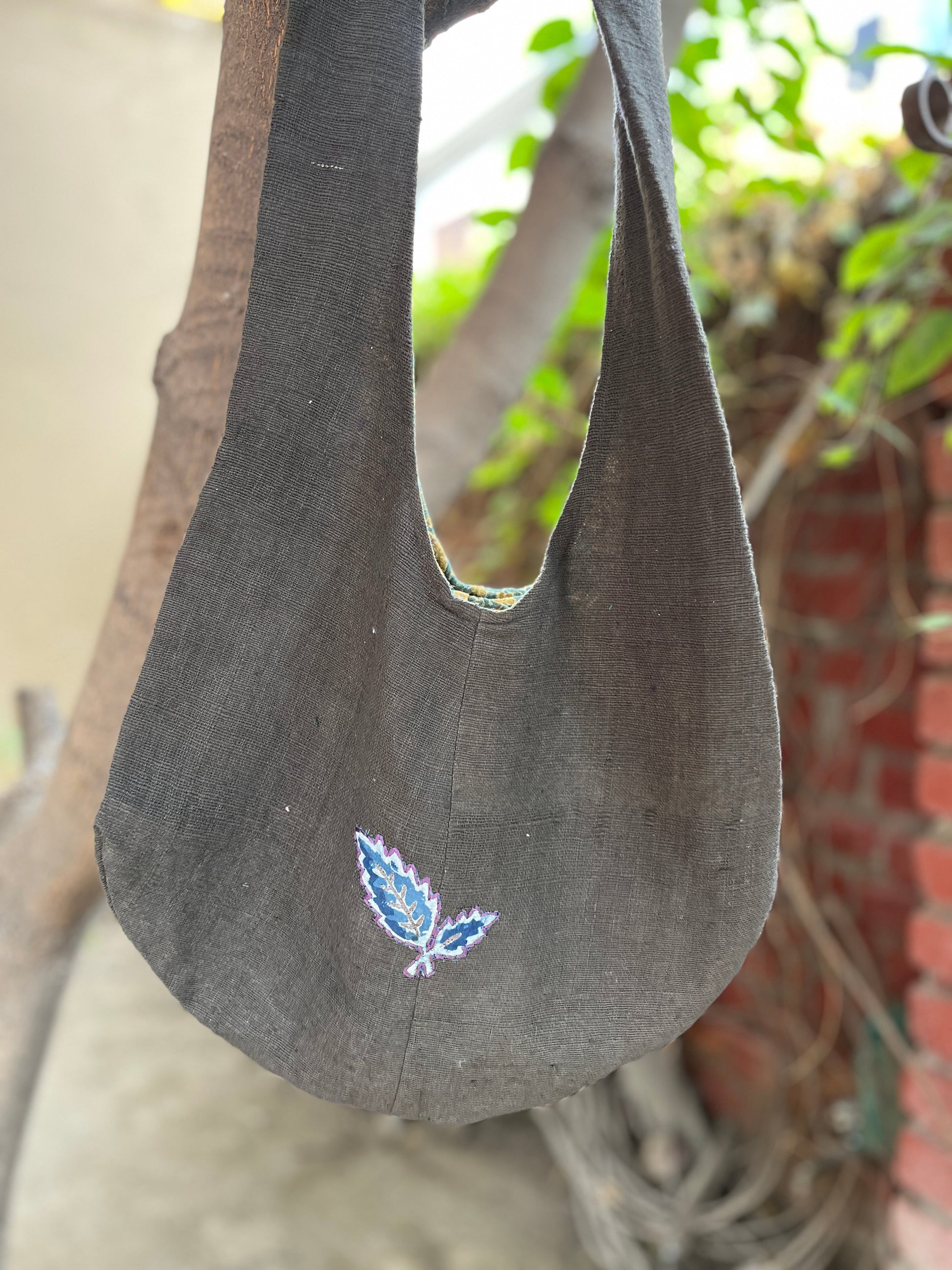 This Unisex Handwoven Charkha Khadi Sling Bag in classic black features a subtle hand-embroidered leaf motif, symbolising nature, balance, and simplicity. Thoughtfully crafted on the traditional charkha, the fabric carries a natural texture that makes each piece truly one of a kind.