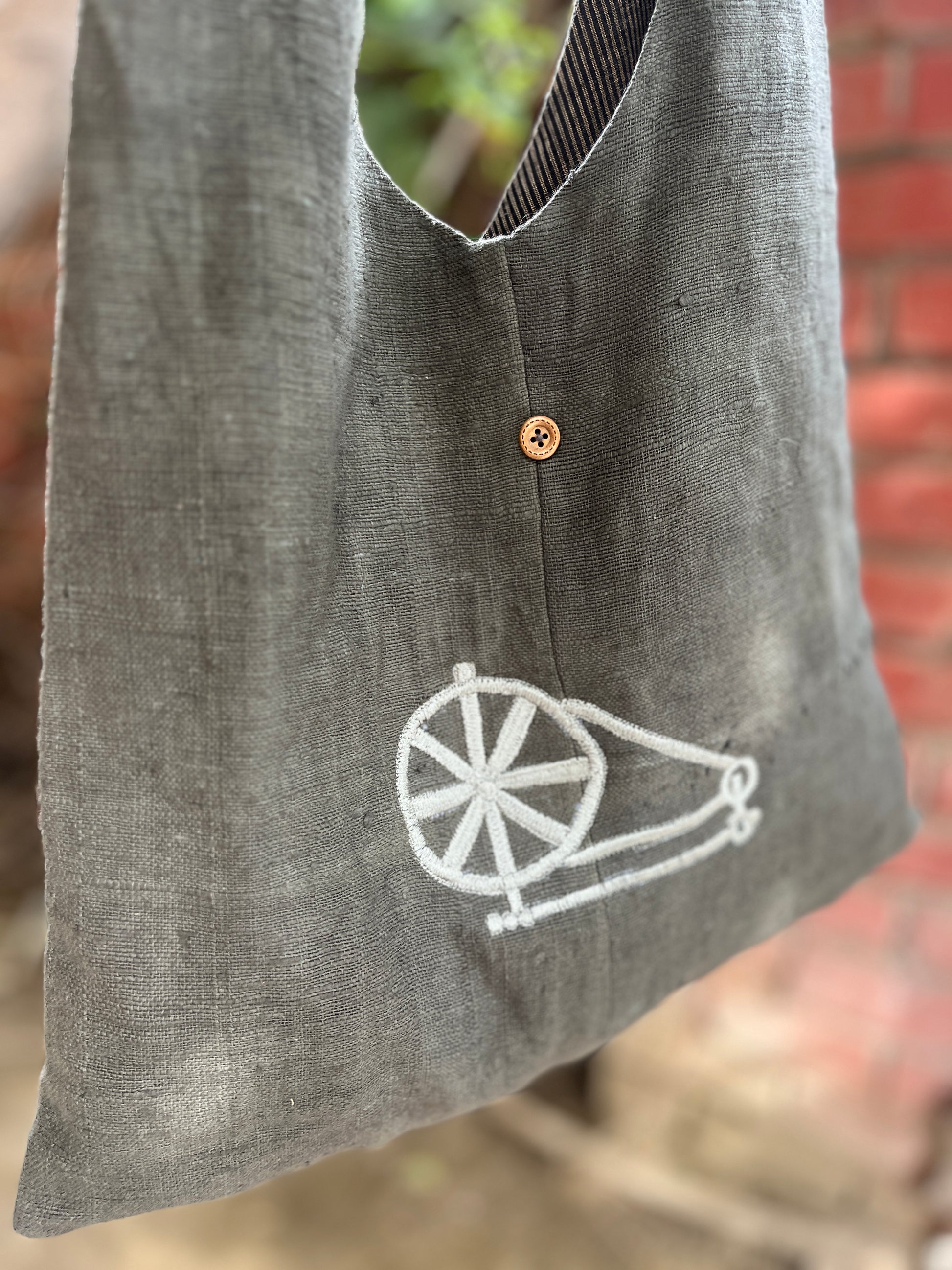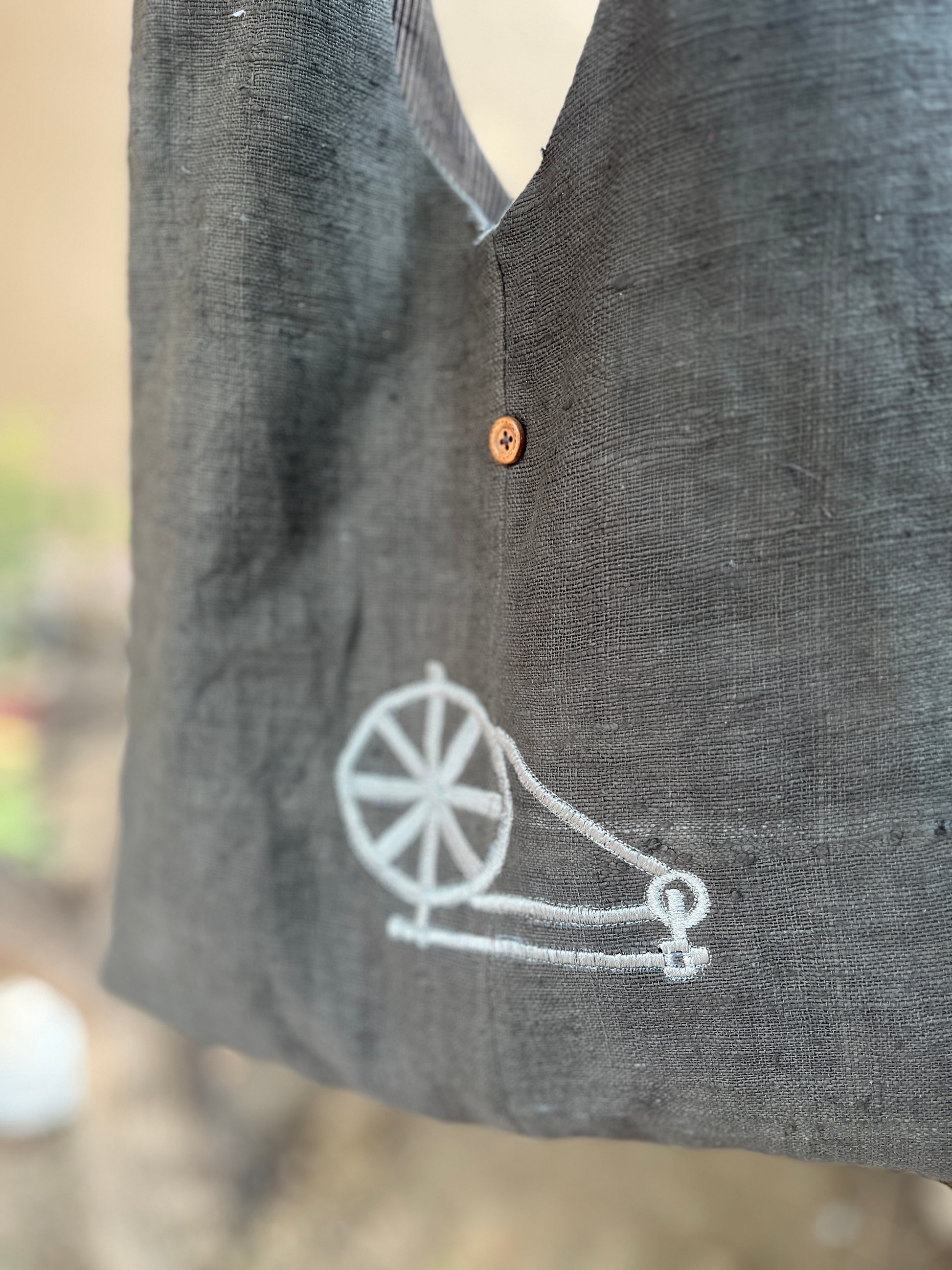 The soft charcoal-grey Khadi fabric gives the bag a natural, earthy aesthetic. Its handwoven texture highlights the authenticity of pure Khadi, making the bag breathable, durable, eco-friendly, and incredibly lightweight. The intricately stitched white Charkha motif stands out beautifully, adding an artisanal charm that makes the bag truly unique.
