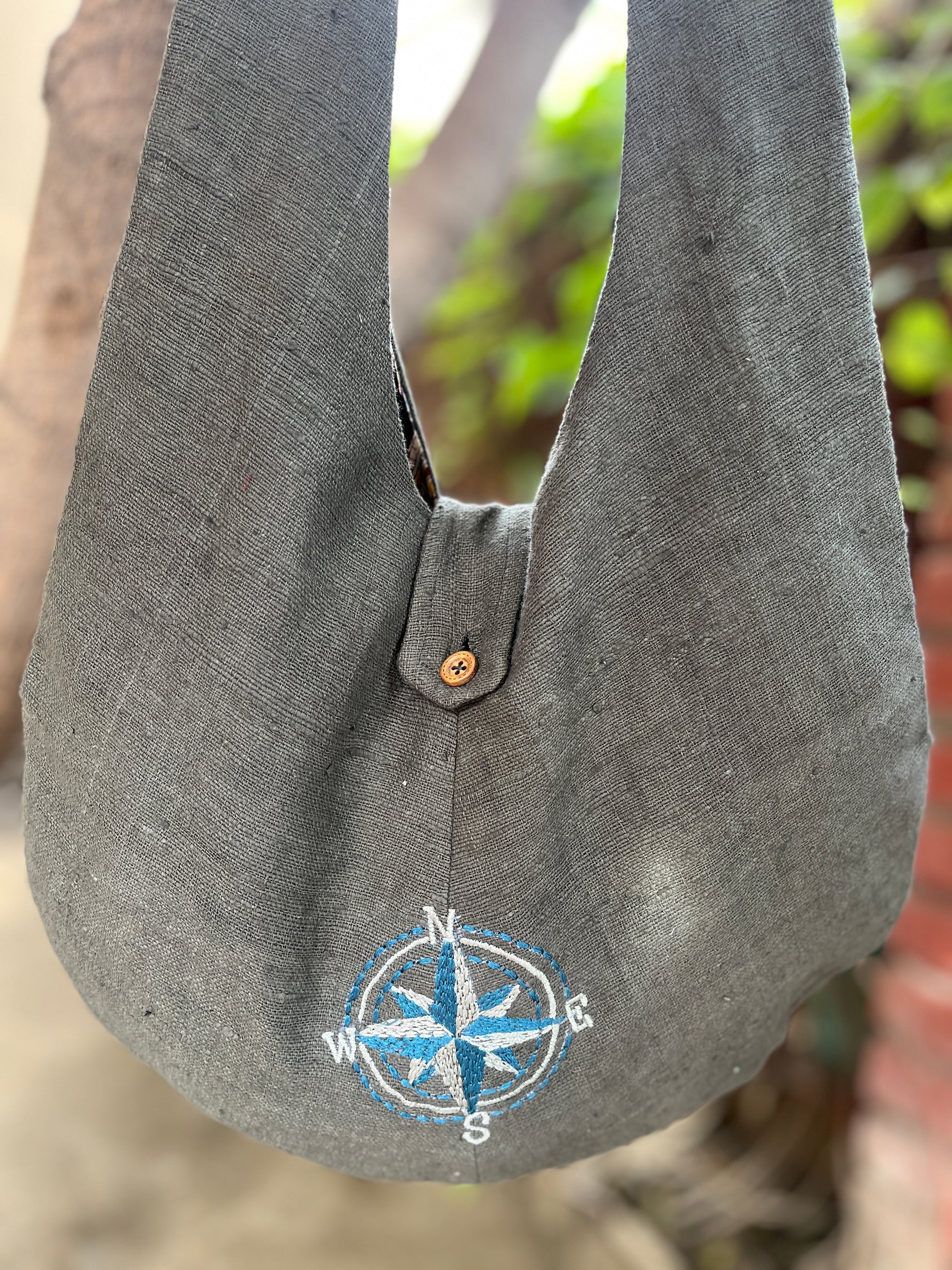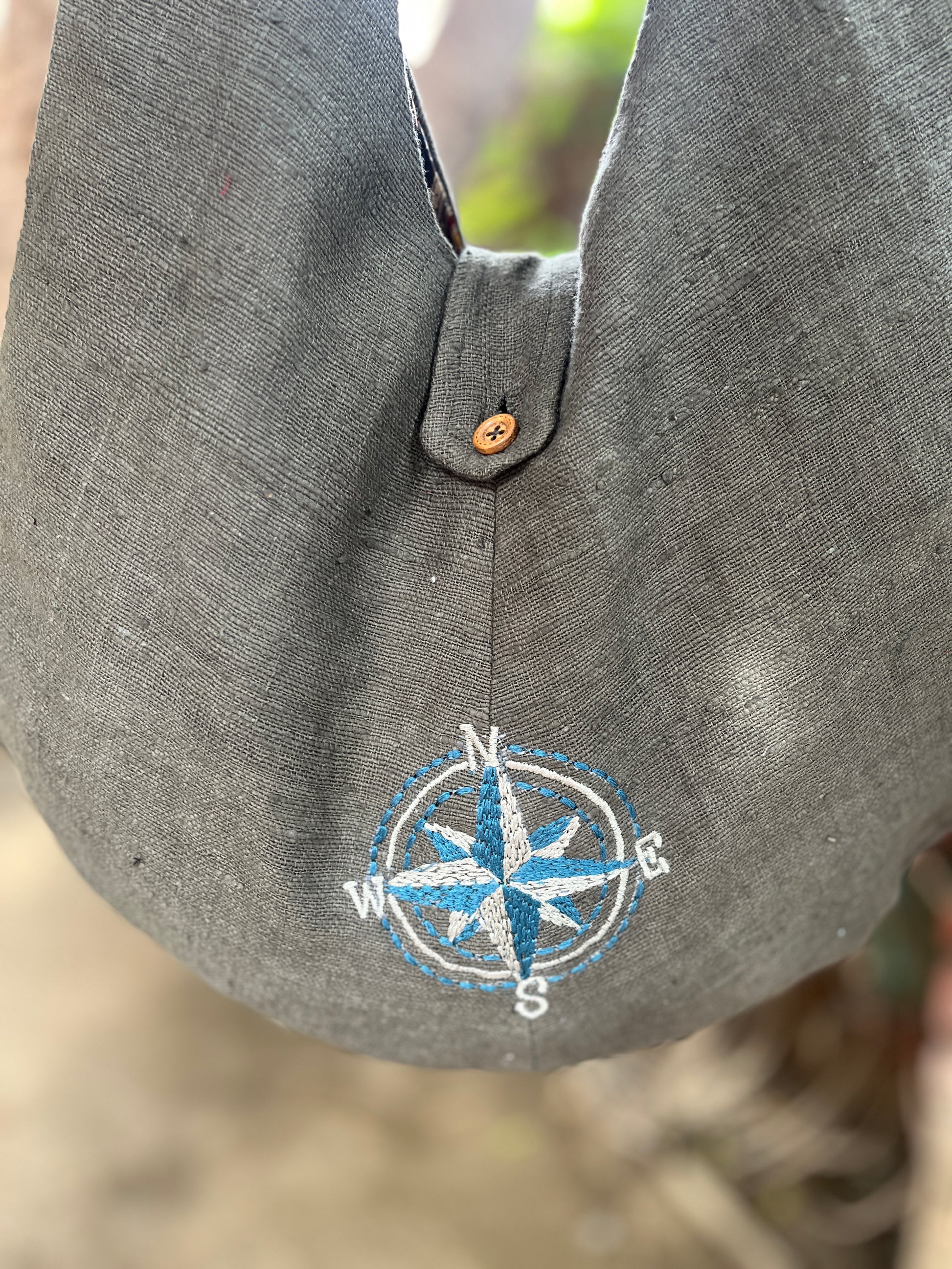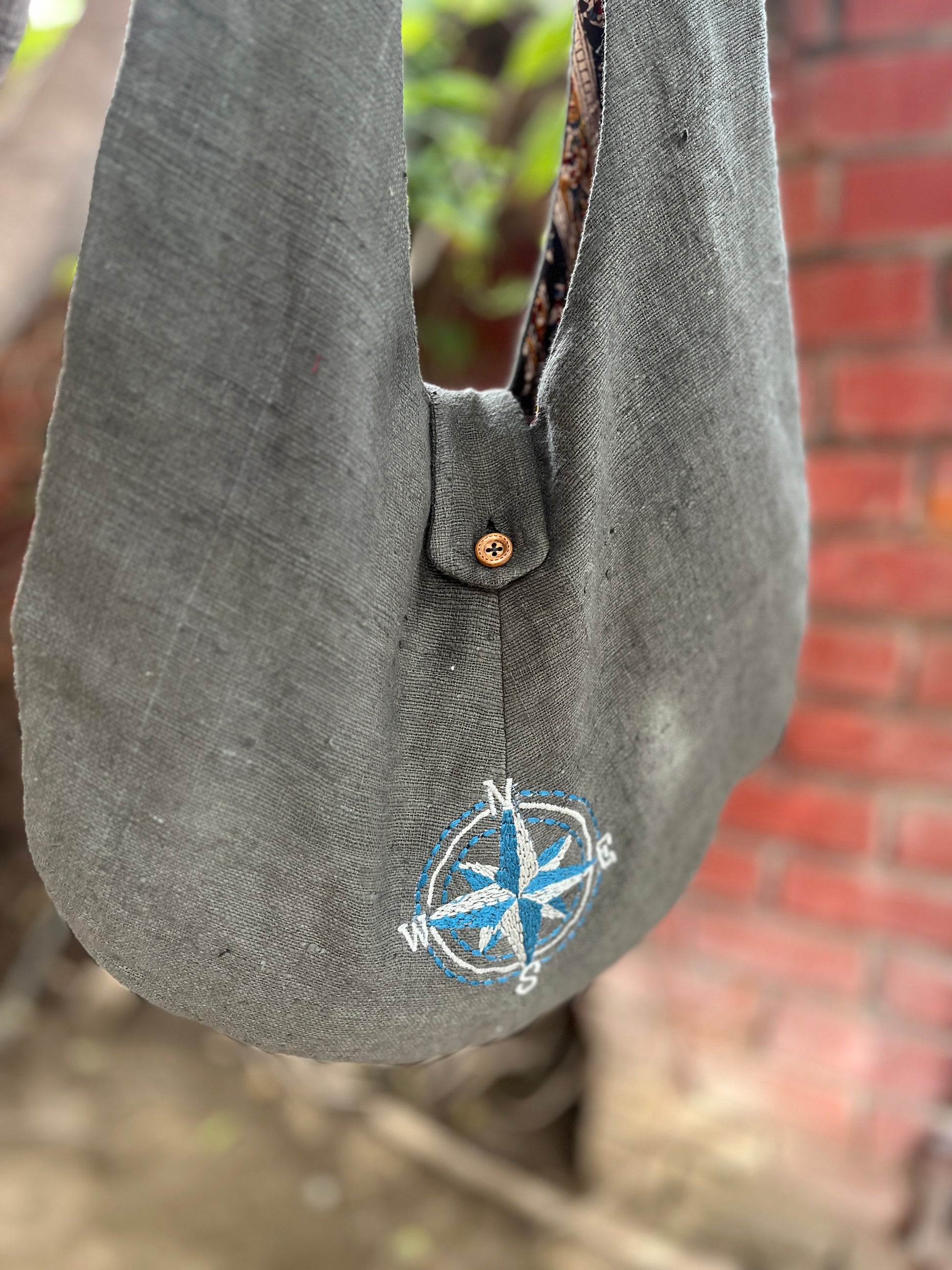 Handcrafted Grey Khadi Sling Bag with Compass Embroidery