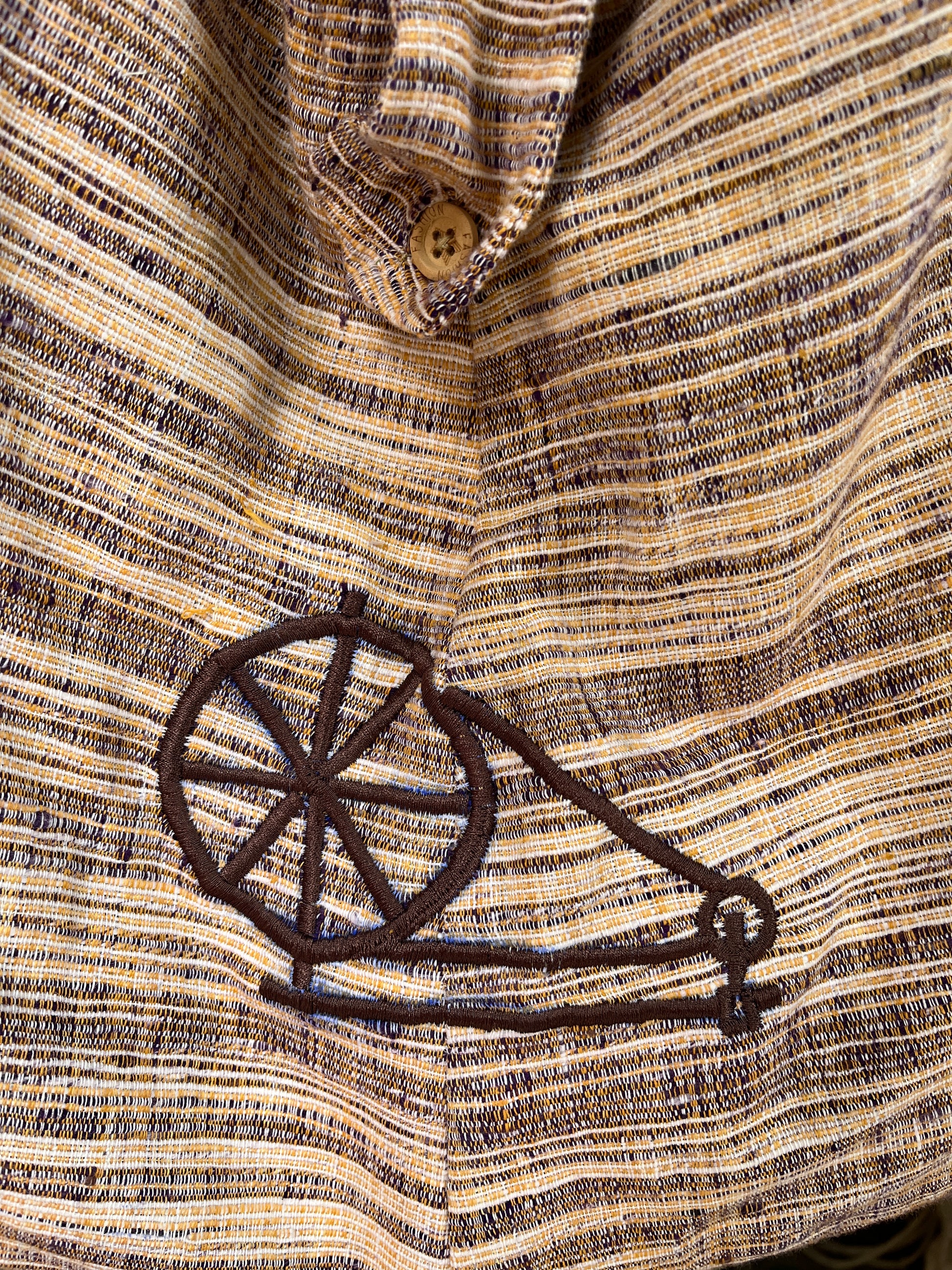 This Unisex Handwoven Charkha Khadi Sling Bag in natural brown showcases a hand-embroidered charkha motif—symbolising self-reliance, tradition, and Indian heritage. The earthy tones and raw handwoven texture make each bag naturally unique.