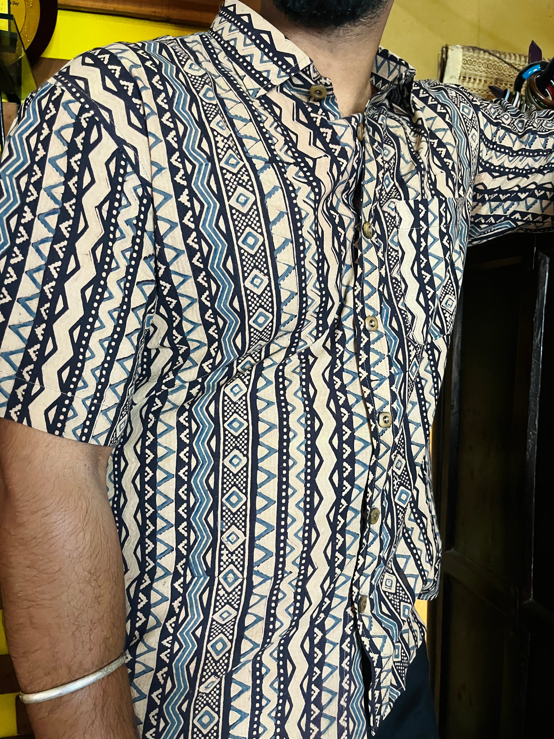 Upgrade your wardrobe with our Tribal Print Vegetal Dyed Shirt, crafted using natural plant-based dyes and finished with bold tribal linework. The rich black shade comes from a traditional vegetal dyeing process, giving the shirt a natural, earthy elegance — completely chemical-free and skin friendly.